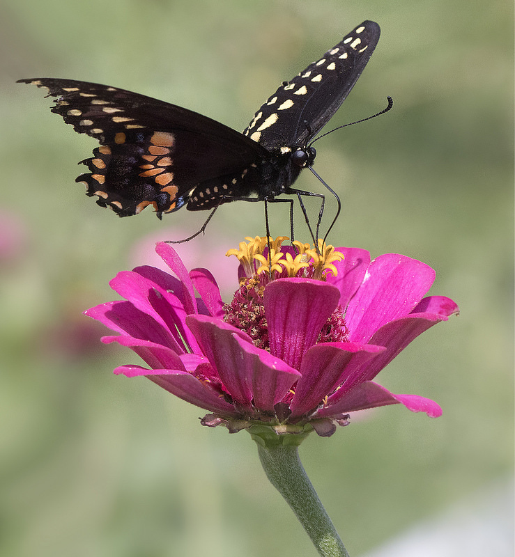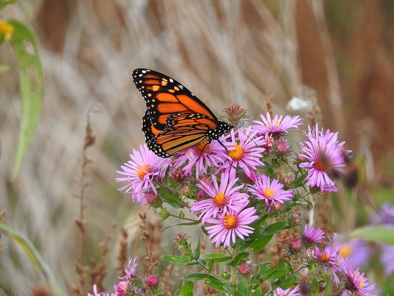 AdultThe pollinating Monarch feeds on the milkweed flowers, lays her eggs there. The caterpillar turns into a butterfly. Eventually they journey to Mexico for the winter.